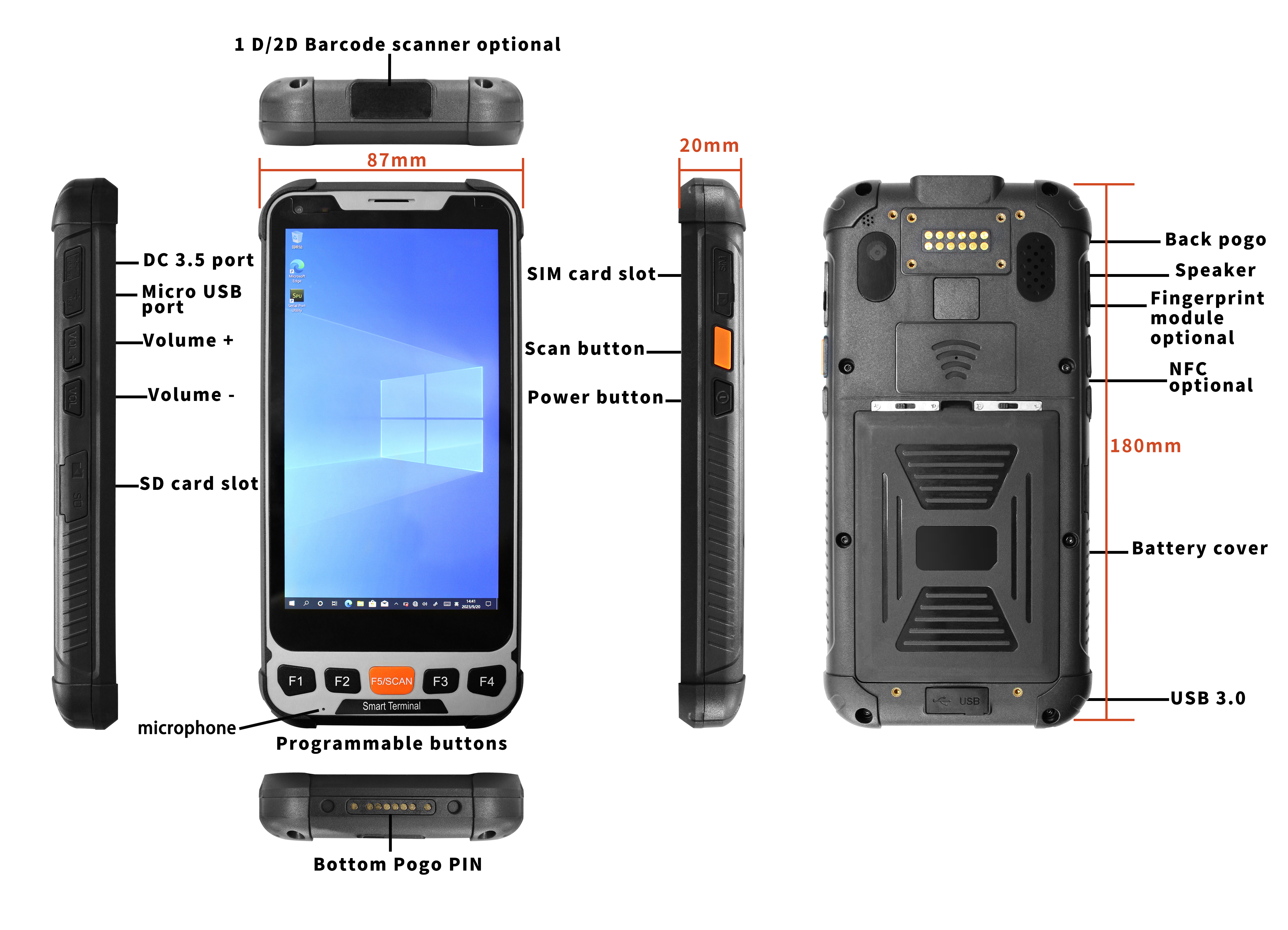 | Interface In/Out Port | Micro USB*1 (OTG); SIM Card Slot*1; TF Card Slot*1; USB 3.0*1; DC*1 (3.5×12mm) Bottom pogopin: USB 2.0; POE Charging Back pogopin: USB 2.0; RS232; Charging |