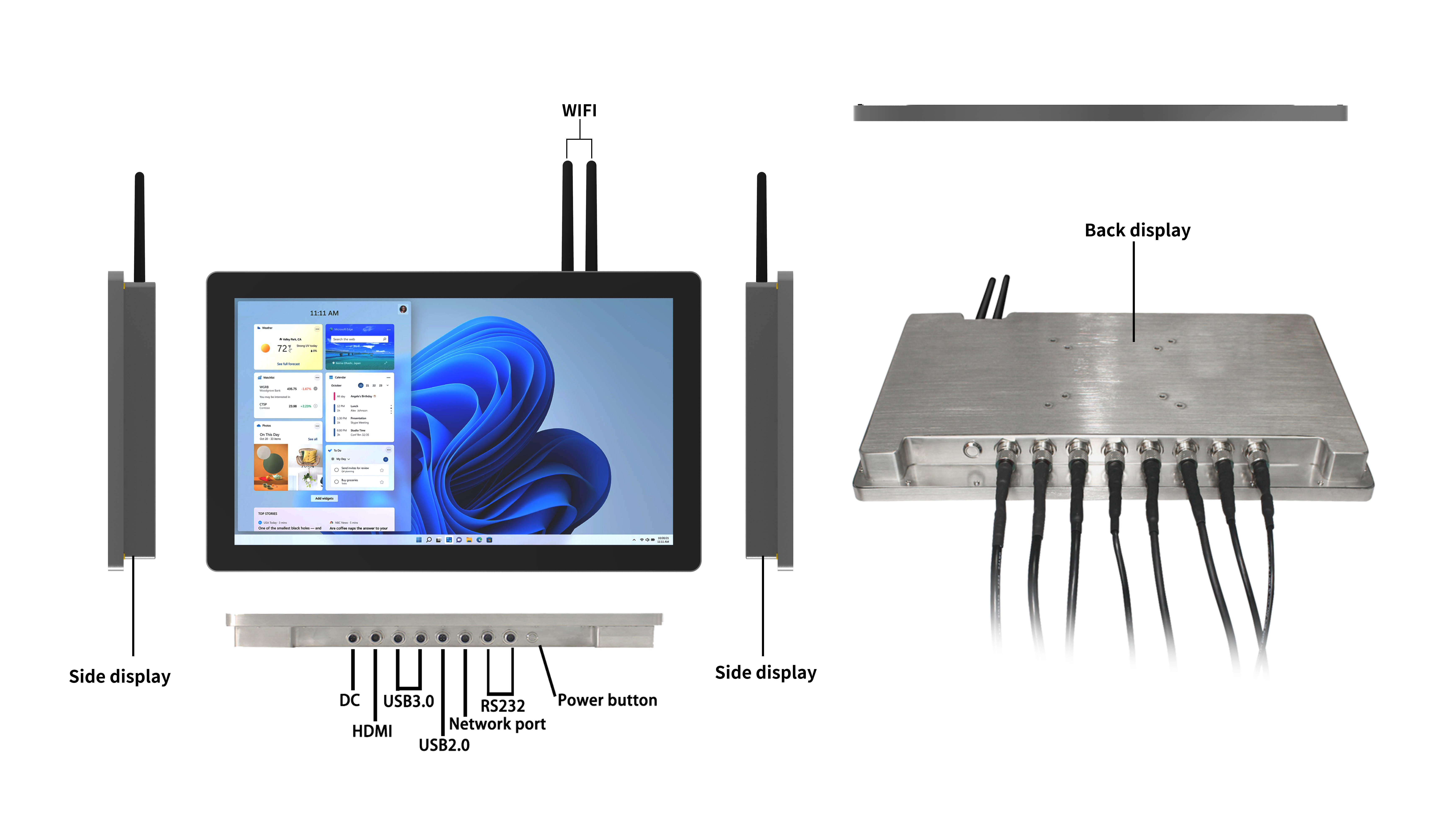 Caixa de embalagem; Adaptador de alimentação DC (12V 4A); Antenas WiFi ×2; Parafusos; Cabos com conectores avionicos ×8 Opcional: Suporte VESA |