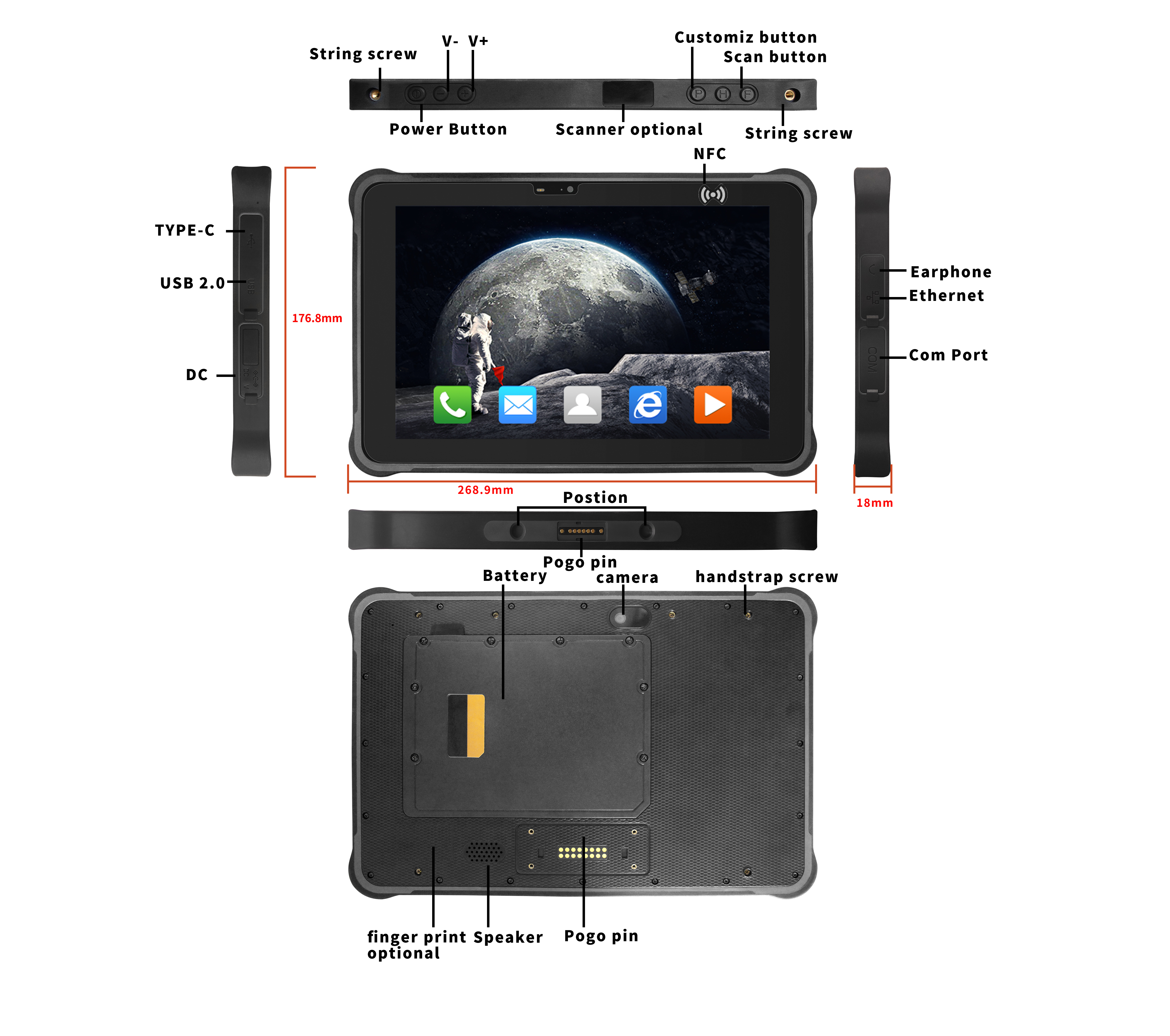 Type-C *1 (OTG); Slot para Cartão SIM*1; Slot para Cartão TF*1; Fone de Ouvido*1; DC*1 (3,5×12mm); USB 2.0 *1; RJ45*1; RS232*1 Pogopin inferior: USB 2.0; Carregamento; RS232 Pogopin traseiro: USB 2.0; RS232 |