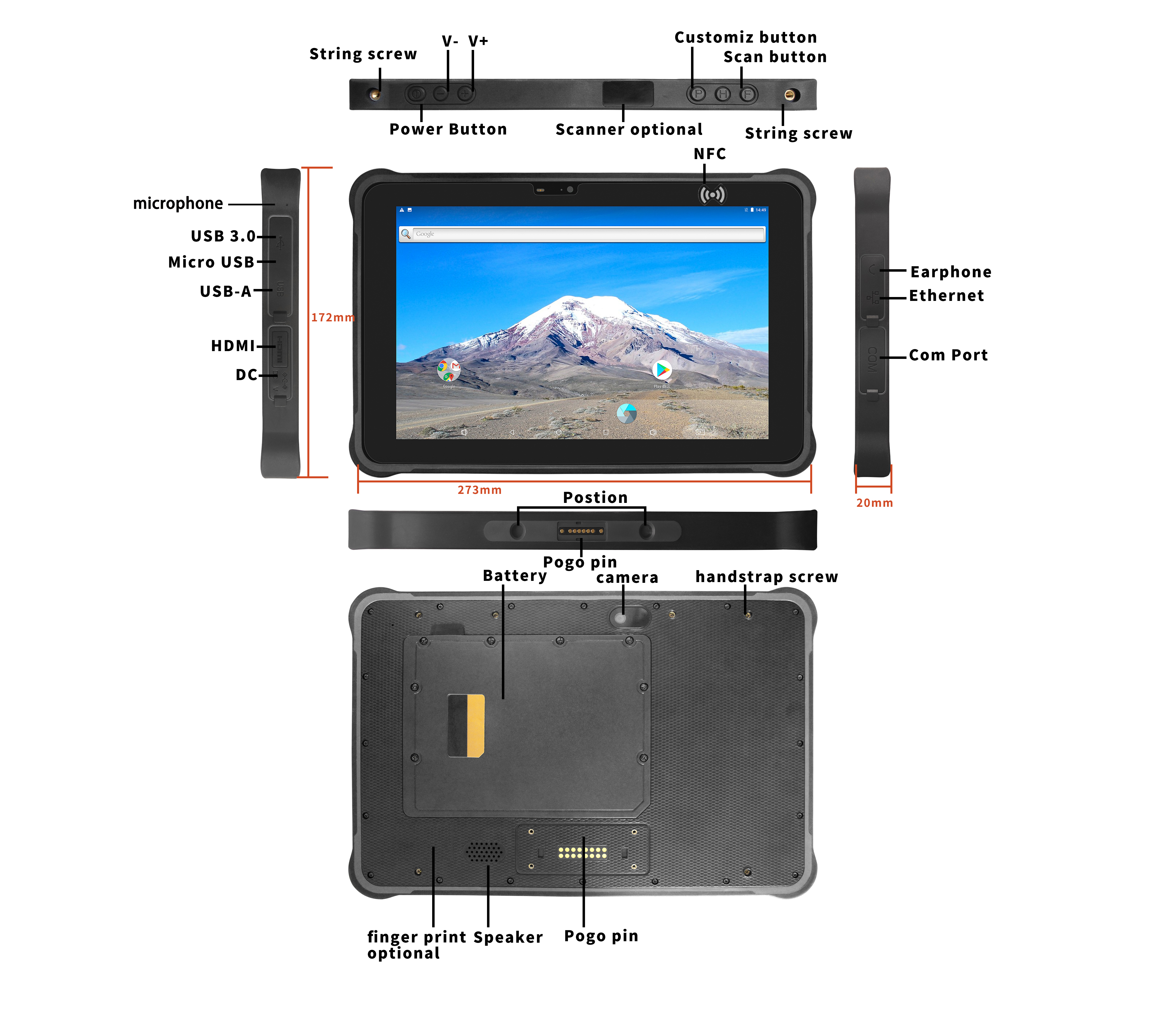 | Portas de entrada/saída | Micro USB ×1; Slot para cartão SIM×1; Slot para cartão TF×1; Fone de ouvido×1; DC×1 (3,5×12mm); USB 2.0 ×1; RJ45×1; RS232×1; USB 3.0 ×1; HDMI×1 Pogopin inferior: USB 2.0; Carregamento; RS232 Pogopin traseiro: USB 2.0; RS232 |