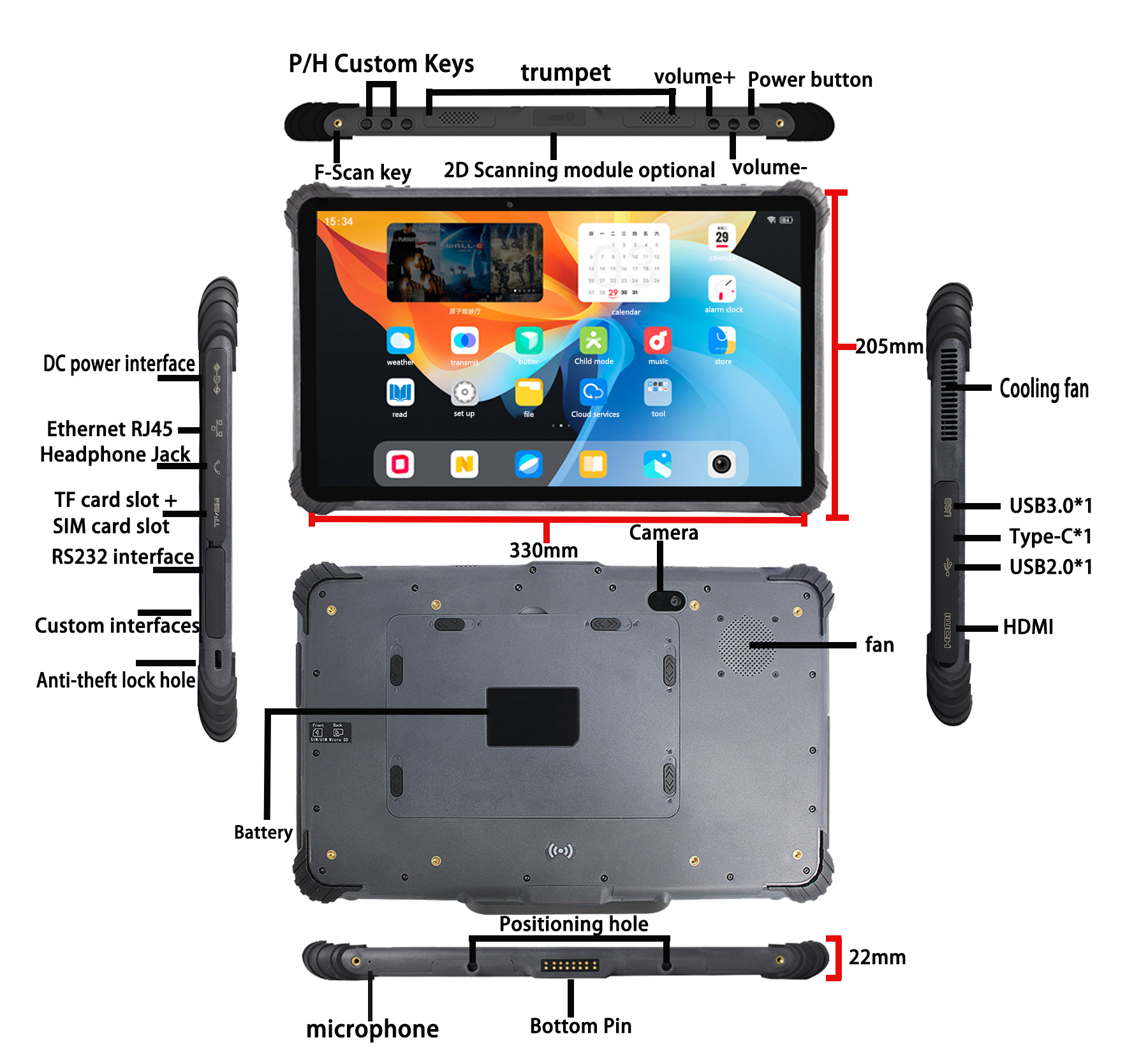 HDMI Type A×1; USB-A (USB 2.0 ×1+USB 3.0 ×1); Type-C×1; Furo de trancamento anti-furto; Interface aviônica ×2 (personalizável & RS232, apenas RS232 TX RX GND suportado); Slot para cartões (SIM+TF); Entrada para fones de ouvido (∮3.5mm); Ethernet RJ45 (10/100/1000M); Interface de alimentação DC (∮4.0mm) Pogopin inferior: USB 2.0; Carregamento; RS232 |