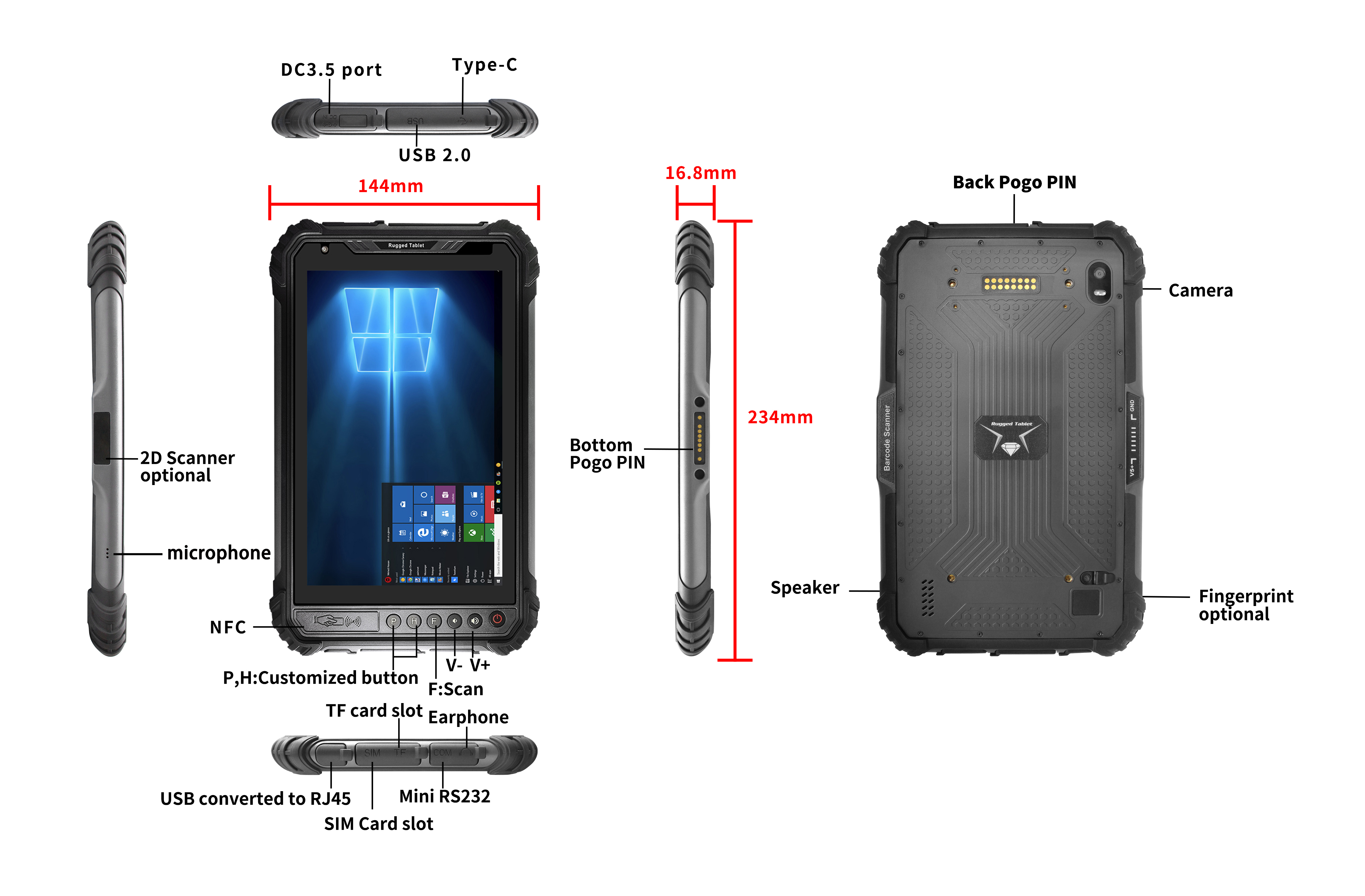 | Interfaces de Entrada/Saída | HDMI×1, Slot para cartão SIM×1, RS232×1 (mini-USB), Entrada para fones de ouvido×1, Entrada de energia CC×1 (4,0×15 mm), USB 3.0 ×3 Pogopin inferior: USB 2.0; Carregamento; RS232 Pogopin traseiro: USB 2.0; RS232 |