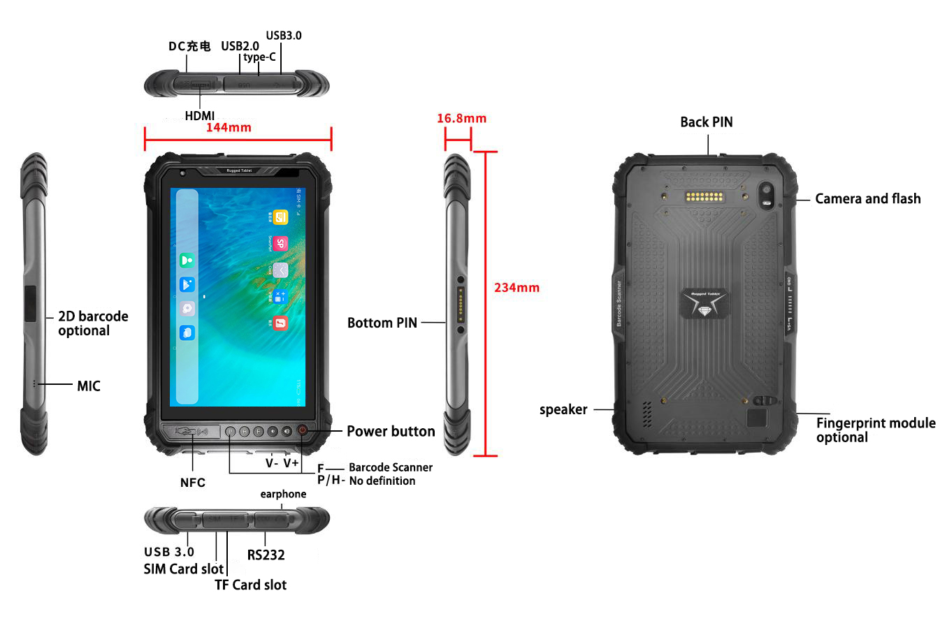 | Interfaces de Entrada/Saída | Type-C *1 (OTG/carga rápida), Slot para cartão SIM*1, Slot para cartão TF*1, Jack de fones*1, Porta DC*1 (4.0*15mm), 1×USB 2.0, 2×USB 3.0, 1×RS232 (mini-USB), 1×HDMI Pinos pogopin inferiores: USB 2.0; Carregamento; RS232 Pinos pogopin traseiros: USB 2.0; RS232 |