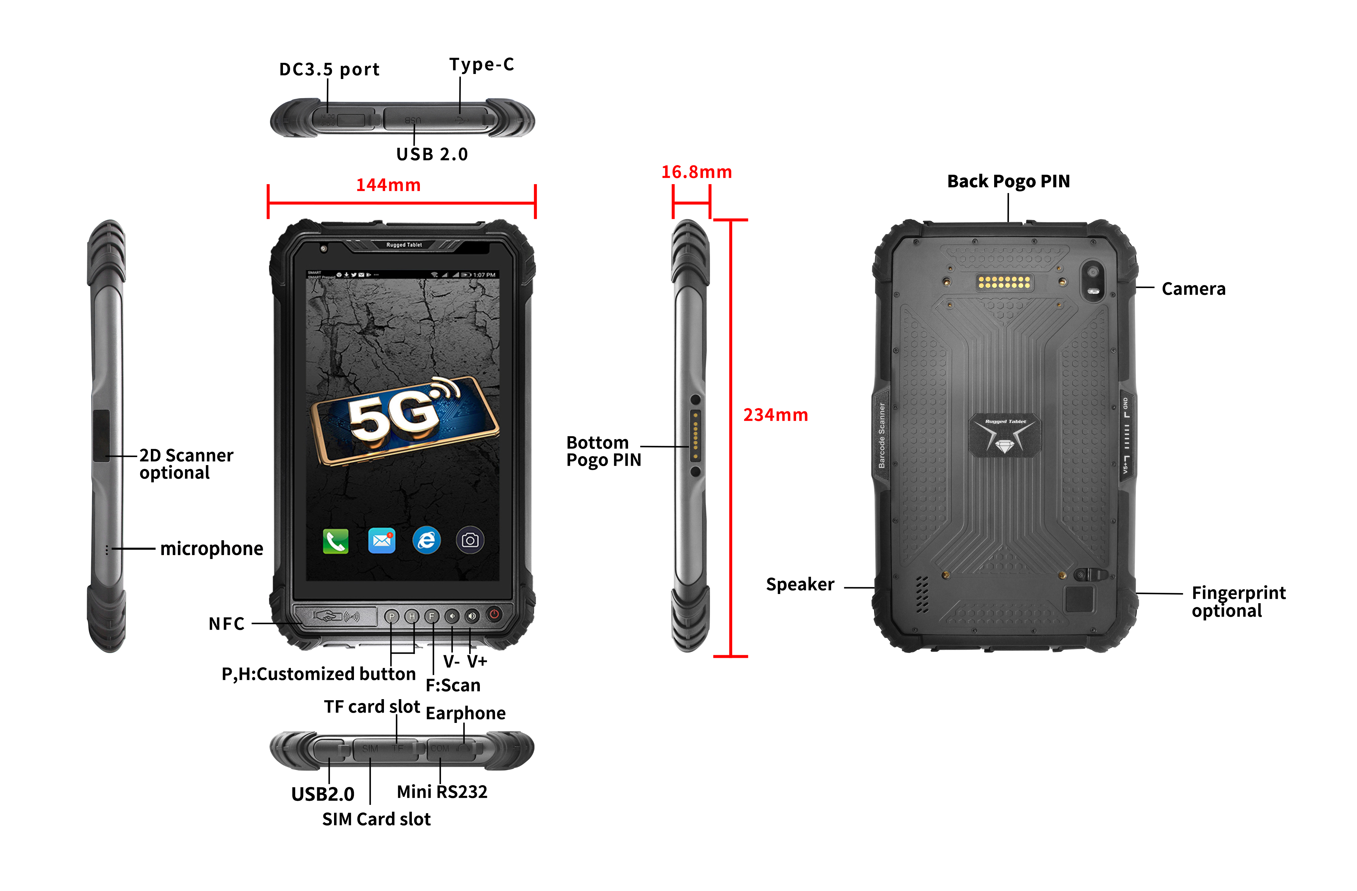 Type-C ×1 (OTG), Slot de Cartão SIM×1, Slot de Cartão TF×1, Fone de Ouvido×1, DC×1 (3,5×15 mm), USB 2.0 ×2, RS232×1 (mini-USB) Pogopin inferior: USB 2.0; Carregamento; RS232 Pogopin traseiro: USB 2.0; RS232 |